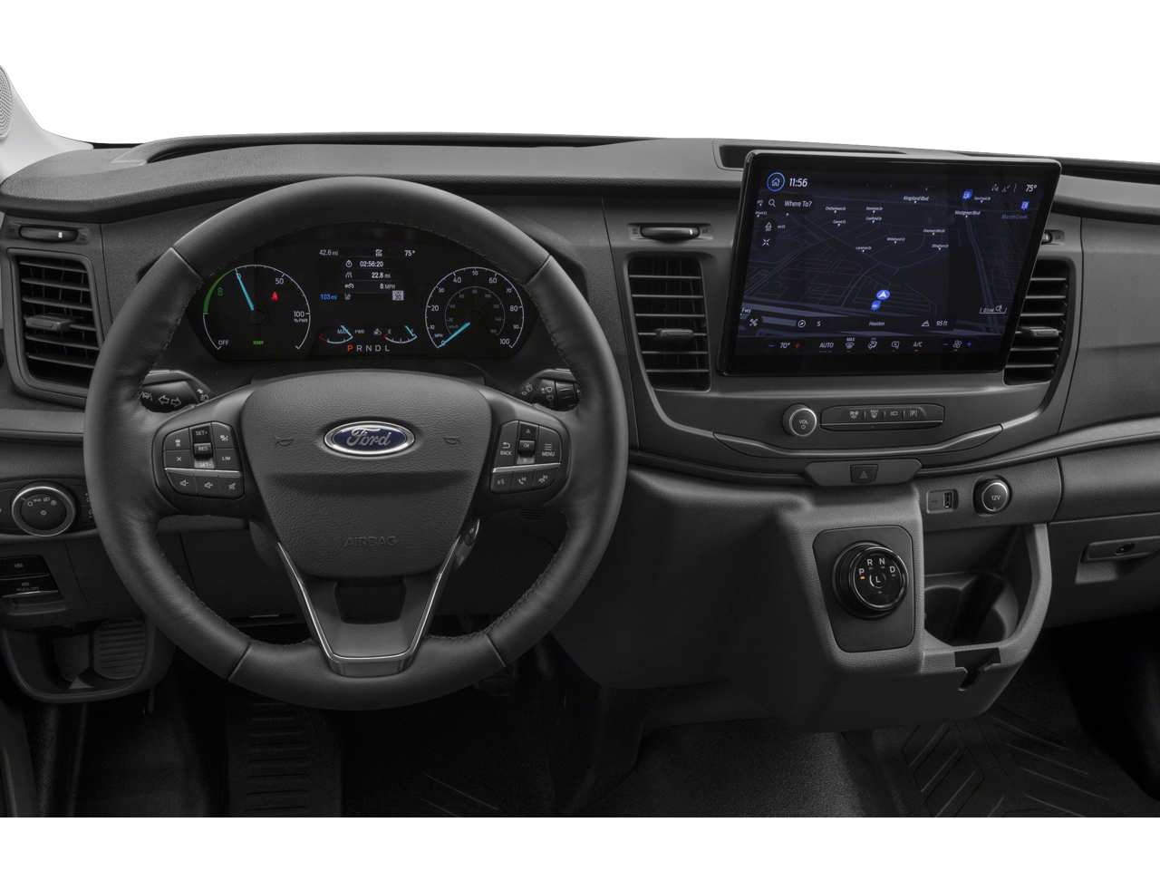 - Radio: AM/FM Stereo w/SYNC 4 -inc: 12" multi-function display, Bluetooth, dual USB ports, embedded voice recognition, connected navigation w/3 years of service available through Ford Pro Intelligence, 4 speakers (front), Ford commercial solutions energy management and vehicle insight tools (access to the Ford charge network, public charging account setup and management, driver public charging tools, home charging reimbursement, Ford E-Telematics dashboard and connected navigation) included for commercial and business customers complimentary for 1 year